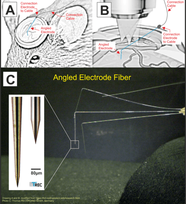 Thomas quartz/platinum-tungsten fiber microelectrodes permit the recording of extracellular potentials with excellent single-unit isolation, signal to noise-ratio and temporal stability. Thomas RECORDING GmbH offers bent electrode fibers that are used, for example, in optical imaging applications. We can offer all of our fiber microelectrodes (i.e., electrodes, tetrodes, and heptodes) in bent versions. The impedance and insulation between individual conductors of tetrodesn and heptodes are not affected by bending the fibers. The fiber electrodes can be equipped with suitable connectors for your preamplifier (e.g., Omnetics). We supply specific holders for mounting the electrode to your microelectrode manipulator. We build your specific electrode according to your requirements. Do not hesitste to contact us with your specific request!