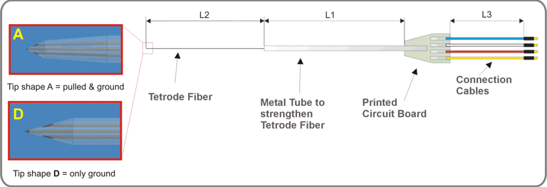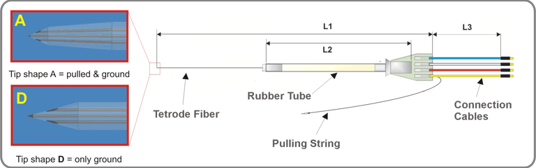 Thomas RECORDING tetrodes are available with two different tip shapes A and D (see picture on the right side). Tip A (pulled & gound tip) has recording contacts that are closer together and have smaller contact areas, resulting in higher impedance values per contact. This means that each tetrode recording contact has a small recording sphere. Therefore electrode tip is very well suited for signal recordings in brain regions with higher cell density. It allows for better isolation of individual units from a multi-unit recording. In contrast, a Thomas RECORDING tetrode with tip shape D (only ground) is very well suited for brain regions with normal cell density. Thomas RECORDING tetrodes are the only tetrodes on the market whose recording properties can be adapted to different cell densities in different regions of the brain!