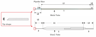 Microinjection pipettes for other than Thomas fiberelectrode microdrives are also made of quartz glass or stainless steel. These microinjection pipettes (OD=100-120µm) are strengthened with an additional glass pipette (OD= 0.5, 1.0, 1.5 or 2.0mm) or a stainless steel tube (OD=305µm) so that you can clamp it to an electrode holder clamp of an electrode manipulator.