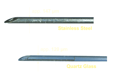 Thomas RECORDING offers a broad range of Injection Cannulas for Microinjections in Neurophysiological Applications – the ideal tool for accurate and reliable drug delivery in neurophysiological research applications. Designed to meet the rigorous demands of neurophysiology, these high-quality cannulas are available in both glass and metal materials, offering optimal performance for a wide range of applications. Thomas microinjection pipettes are available for use with Thomas Microdrive systems (e.g. Mini Matrix, Eckhorn Matrix) or for other microdrives or manual electrode manipulators. We customize our products to meet your requirements. Please feel free to contact us for your individual cannula design.