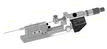 The digital syringe pump is a manual oparated pump with a digital display that allows a recise injection rate calculation. The Thomas manual microinjection pump (MMP) is a convenient tool for precise manual injection of fluid using our microinjection glass or metal pipettes. The design allows visual feedback of flow at the pipette tip. The resolution of the injection volume can be continuously varied from nanoliters to the microliter range, depending on the syringe used. The device is available with a digital (MMP-D, article number: AN001878) manual operated micrometer drive. The Model MMP-D has the mechanical micrometer head with a digital display with a resolution of 10 microns per division and advances 500 micrometers per revolution. The injector is constructed with anodized aluminum for excellent stability and durability. The piston of the micrometer can be slid across the rail to the syringe's plunger position. The device uses a 1ml syringe with excellent performance for high pressure injection. We connect our glass injection fibers (OD=120µm, quartz glass) directly or via a special thick wall plastic tube to the syringe.