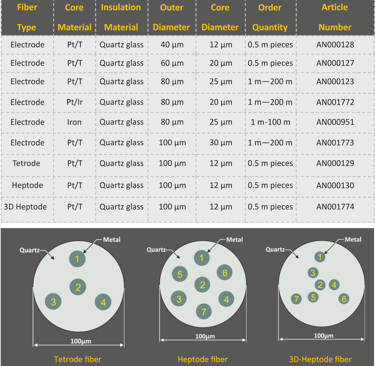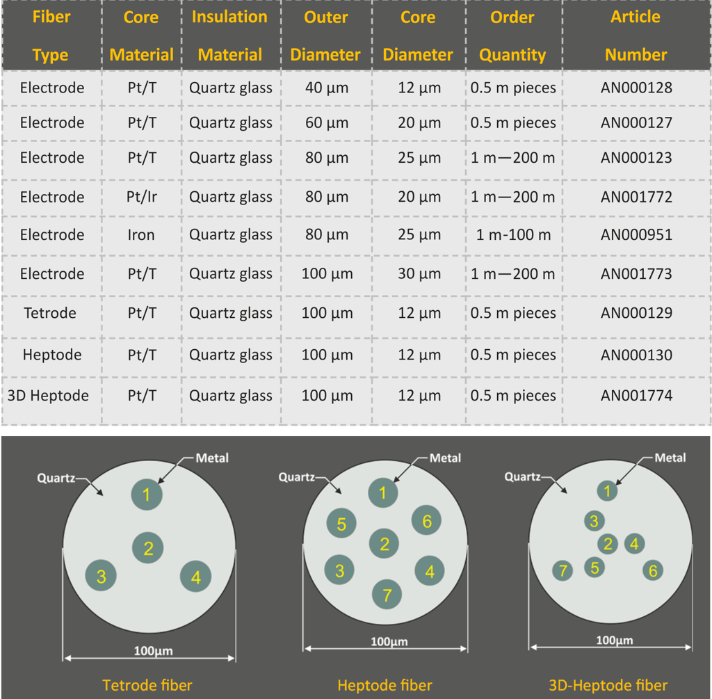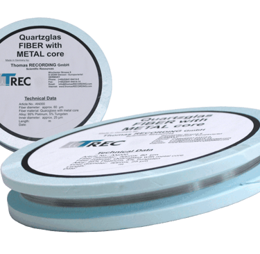 The Thomas RECORDING electrode fiber raw material is a quartz glass insulated platinum (95%)/tungsten (5%) fiber material with outer diameters of 80 µm (standard). Other fiber diameters are available on request. This raw material is used to build microelectrodes for neurophysiological or electrochemical applications. In addition to the necessary raw materials, we also offer the required manufacturing equipment such as tip pullers and grinding machines, as well as the necessary tools for electrode production.