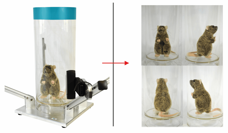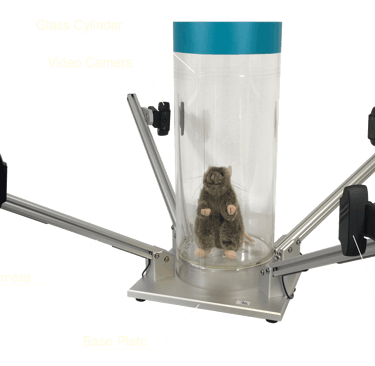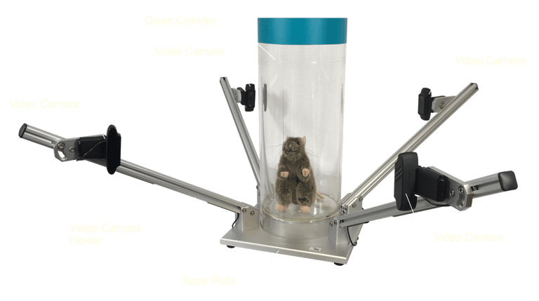 The Thomas cylinder test system is a new fully integrated device for the automatic measurement and fast analysis of the classical “Schallert cylinder test”, typically used for investigating the exploratory and motor behavior of rodents. The system works with up to 4 video cameras and video recording software that captures the movement of the animal inside a glass cylinder. Up to four video cameras allow continuous and time-synchronized recording of animal movements from four different perspectives. Video files will be stored on the connected personal computer hard disc. Additionally to the video recording software we will soon offer a software for marker less pose estimation based on transfer learning with deep neural networks.
