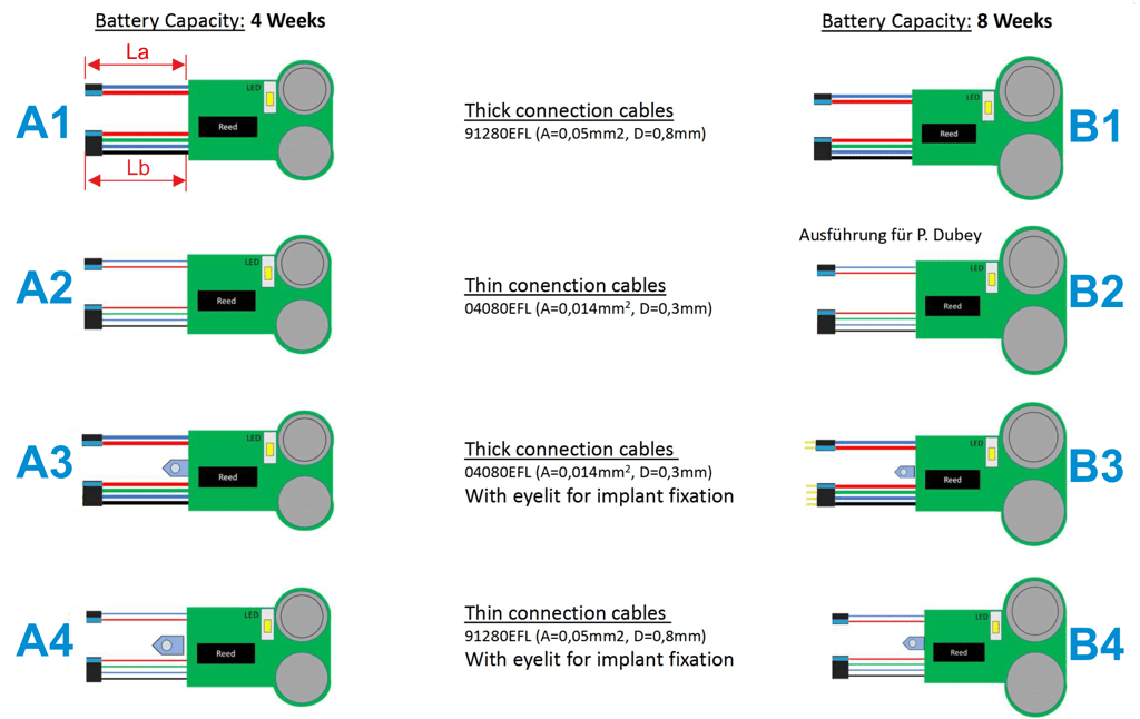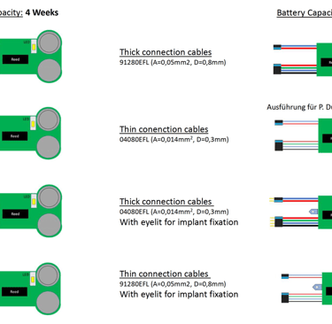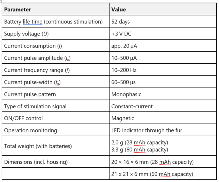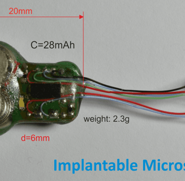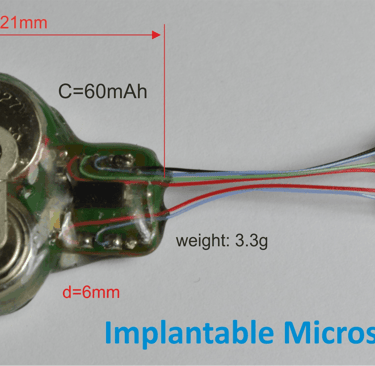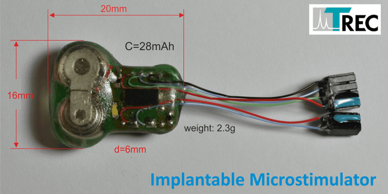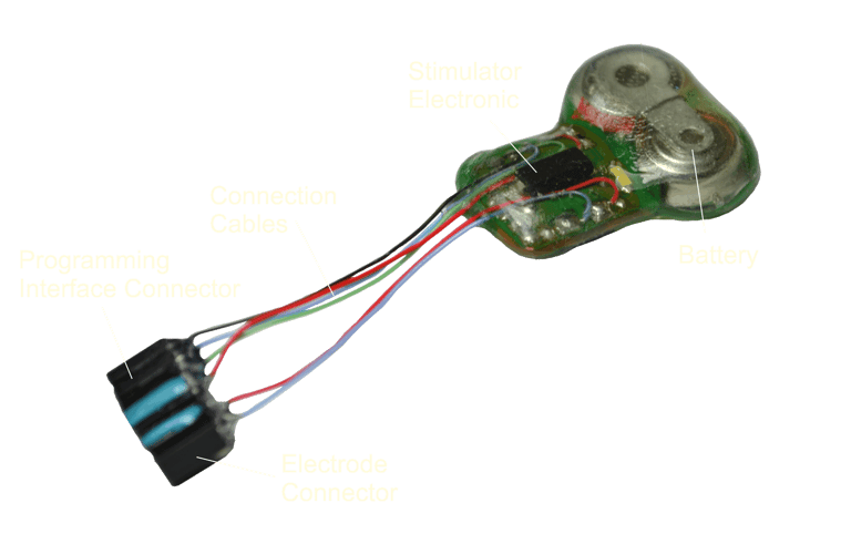 The implantable microstimulator is available in two different sizes with two different battery capacities (see techncial details). The smaller version is more lightweight and well suited for mice. The larger version has higher battery capacity and is used for rats. The microstimulator is equipped with two conenction cables, one for conencting the stimulator to the implanted stimulation electrodes and one cable to conenct the stimulator to the programming interface. The programming interface is used to re-program the software of the stimulator before or after implantation. The microstimulator has integrated batteries and a medical grade housing to guarantee biocompatibility when implanted.