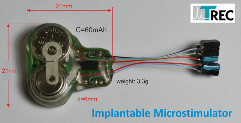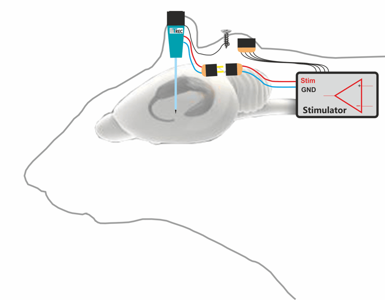 The Thomas RECORDING offers a novel wireless microstimulation system for deep brain stimulation (wDBS) tailored for rodents. Our IMS is a standardized, wearable microstimulation system suitable for translational DBS research in freely moving animal models. Recognizing that DBS systems in human patients offer programmable options for key stimulation settings such as current amplitude, stimulation frequency, and pulse width, we integrated similar programmability into our wDBS microstimulation system. The wDBS microstimulation system consists of the microstimulator, which can be connected to an implanted stimulation microelectrode. Our quartz-glass insulated platinum–tungsten fiber microelectrodes for stimulation have a shaft diameter of just 100 μm and carry a small tip, causing minimal tissue damage and allow a high spatial resolution and stimulation selectivity for the DBS process. To ensure the reproducibility of wDBS experiments, we have standardized the stimulation microelectrodes with respect to dimensions and electrical properties. For details see “Features” section below: