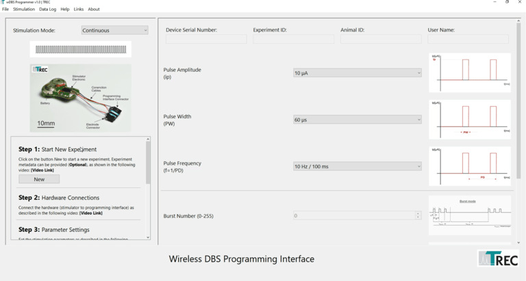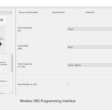 The microstimulator is programmed using a programming adapter that is connected to the USB port of a computer. The stimulation parameters can be selected via the GUI of a programming software. It is also possible to transfer metadata of the experiment (e.g., serial number of the stimulator, date, stimulation parameters, etc.) to the database of the programming software. This makes it easier to document the stimulation experiment. The stimulator can be programmed or re-programmed before or after implantation