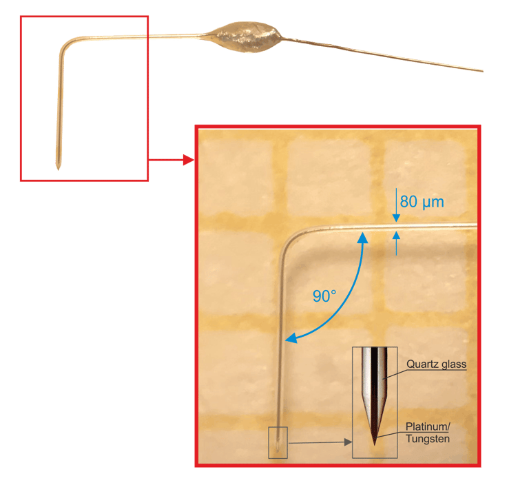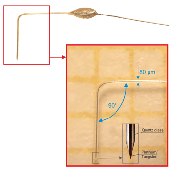Thomas quartz/platinum-tungsten fiber microelectrodes permit the recording of extracellular potentials with excellent single-unit isolation, signal to noise-ratio and temporal stability. Thomas RECORDING GmbH offers bent electrode fibers that are used, for example, in optical imaging applications. We can offer all of our fiber microelectrodes (i.e., electrodes, tetrodes, and heptodes) in bent versions. The impedance and insulation between individual conductors of tetrodesn and heptodes are not affected by bending the fibers. The fiber electrodes can be equipped with suitable connectors for your preamplifier (e.g., Omnetics). We supply specific holders for mounting the electrode to your microelectrode manipulator. We build your specific electrode according to your requirements. Do not hesitste to contact us with your specific request!