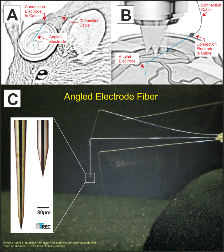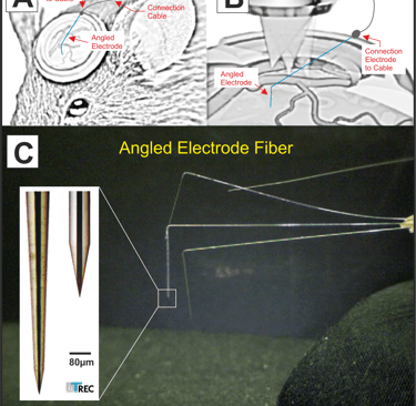 The picture on the right side shows an extracellular recording electrode in a rat brain. In extracellular recordings for optical imaging, where you don't want the electrode to obstruct the visual field for the microscope, the recording electrode must meet several key requirements to ensure effective recording and minimize interference with the imaging process. Thin and Narrow Electrodes: The electrode should be as small as possible in diameter to minimize obstruction. Microscale Geometry: A shank that is small enough in width and length to allow the optical system to focus on the tissue of interest without interference. Our microelectrode fibers are very thin (80 µm) so they are narrow enough to avoid significant visual field blockage. Transparent Coatings: Electrode surfaces, particularly those that are exposed to light during imaging, should ideally have a coating that does not interfere with the microscope’s imaging, such as transparent coatings. Our electrodes are insulated by quartz glass!