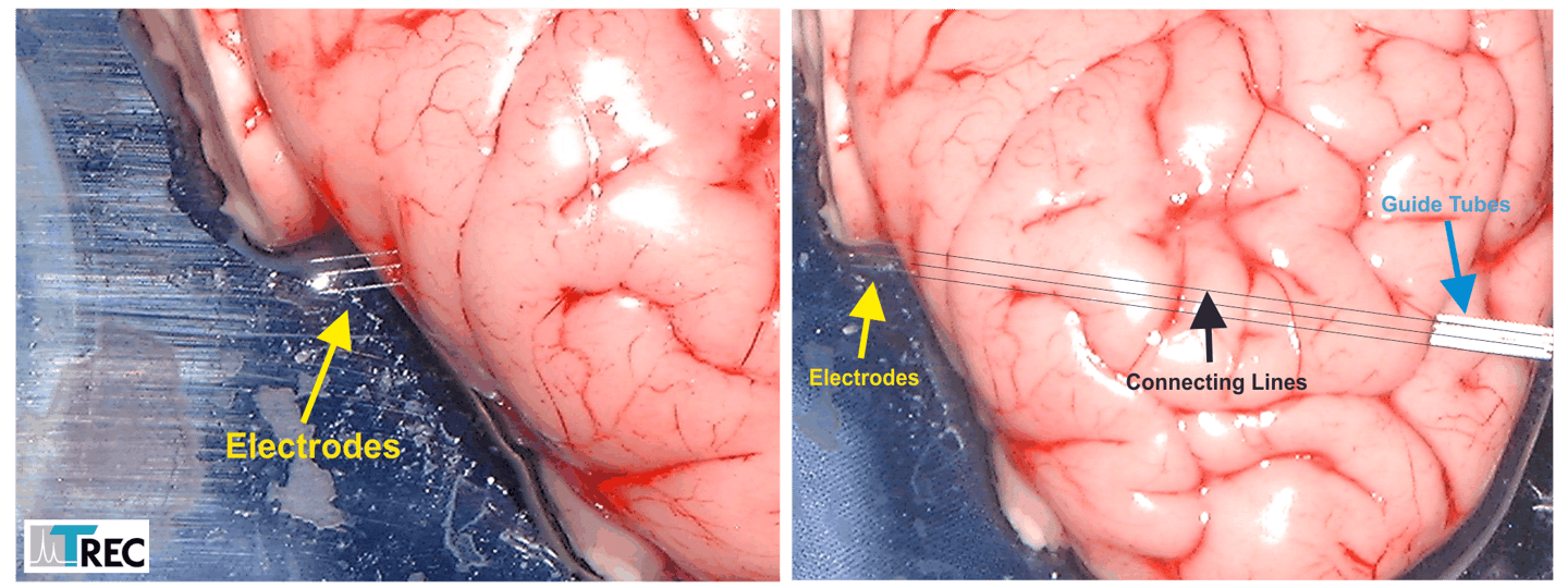 Figure 3: These pictures show a penetration test with Thomas fiber microelectrodes. The electrodes moves straight through the brain over a distance of 40.000µm although the fibers just had 80µm outer diameter. The drawn connecting lines in the rigth photo show that the exit points of the elelctrodes are exactly at the opposite side of the entrance points.