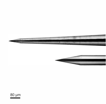 Electrodes with ground tips (tip shape D) are very well suited for recording of multi-unit-activity (MUA), local-field-potentials (LFP) and for microstimulation of brain tissue (Impedance value at 1kHz in the range of 300kΩ to 800kΩ, depending on the fiber shank diameter and the grinding angle).