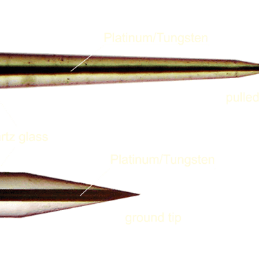 Thomas quartz/platinum-tungsten fiber microelectrodes permit the recording of extracellular potentials with excellent single-unit isolation, signal to noise-ratio and temporal stability. Thomas RECORDING GmbH offers a complete line of metal microelectrodes for recording extracellular potentials from single units and cell populations. The electrodes are very well suited to be applied to the electrode manipulators manufactured by Thomas RECORDING GmbH, but they may also be used for other applications. The electrode fibers are available with shank diameters ranging from 20 µm to 120 µm. Standard measures of our quartz-platinum/tungsten electrode fibers are 80 µm for the outer shank diameter and about 25 µm for the diameter of the metal core (other diameters on request!). A special developed manufacturing technique makes it possible, for tips to be drawn on these thin fibers, with both the outer quartz mantle and the metal core tapering down to very small dimensions. With a specific grinding technique the metal core is subsequently exposed to the required tip size respectively tip impedance (see “Manufacturing Equipment”).