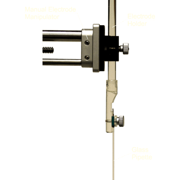 The fiber microelectrodes are also available for standard manual melectrode manipulators or motorized single shaft electrode manipuators like the Thomas RECRODING MEM. The picture on the right side shows a TREC manual microdrive loaded with single core fiber microelectrode.