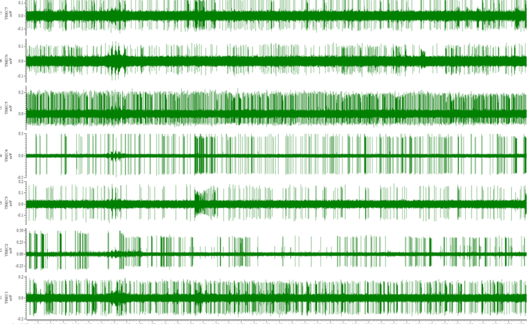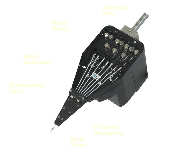 The picture on the rigth side shows an extracellular recording in primate amygdala with 7 Thomas quartzglass insultated platinum/tungsten fiber-microelectrodes loaded in a Thomas RECORDING multielectrode drive type 7 Electrode Eckhorn Matrix.