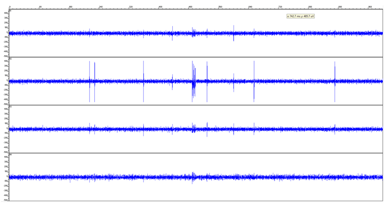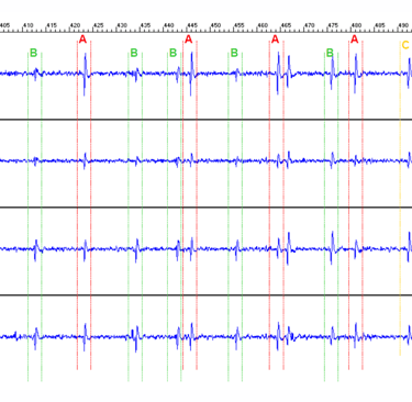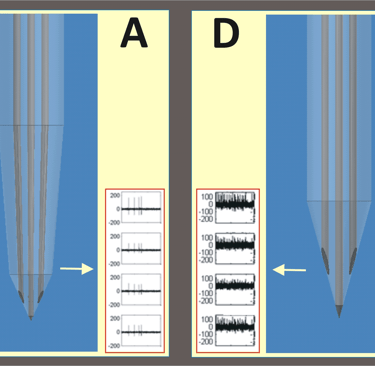 The picture on the left side shows an extracellular recording with a Thomas RECORDING tetrode in subthalamic nucleus of an anesthetized dystonia patient, University Hospital Heidelberg. One can discern up to three different units out of the multi unit tetrode recording (unit A, B and C) based on the stereotrode effect.