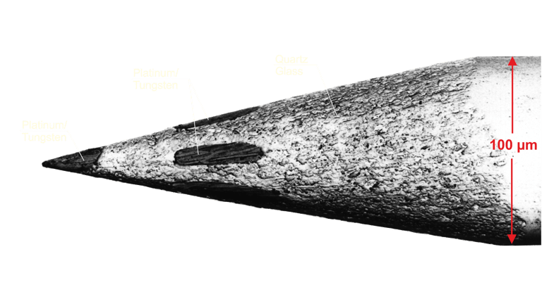 Thomas RECORDING tetrodes are available with two different tip shapes A and D (see picture on the right side). Tip A (pulled & gound tip) has recording contacts that are closer together and have smaller contact areas, resulting in higher impedance values per contact. This means that each tetrode recording contact has a small recording sphere. Therefore electrode tip is very well suited for signal recordings in brain regions with higher cell density. It allows for better isolation of individual units from a multi-unit recording. In contrast, a Thomas RECORDING tetrode with tip shape D (only ground) is very well suited for brain regions with normal cell density. Thomas RECORDING tetrodes are the only tetrodes on the market whose recording properties can be adapted to different cell densities in different regions of the brain!