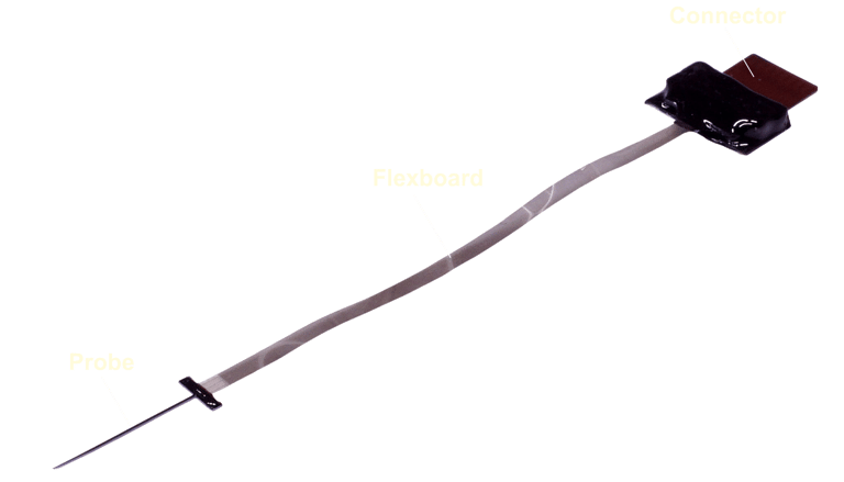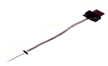 The silicon probe for chronic recording applications provided by Thomas RECORDING is avaialble in two different configurations. One version is assembled onto a 3-cm-long ultra-flexible polyimide cable (flexboard) designed to interface with a ZIF-plug or Omnetics connector. This chronic layout is perfectly suitable for chronic experiments and setups where it is recommended to mechanically decouple the connector from the silicon probe. This chronic probe is implanted using the Thomas RECORDING implantation tool and water soluable glue (see video below). There is a variety of probe configurations and connector types that we can provide at the other side of the flexboard cable so we can make sure your existing headstage will be compatible with the electrode array.