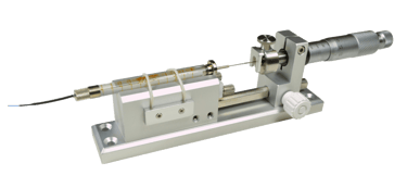 The Thomas manual microinjection pump (MMP) is a convenient tool for precise manual injection of fluid using our microinjection glass or metal pipettes. The design allows visual feedback of flow at the pipette tip. The resolution of the injection volume can be continuously varied from nanoliters to the microliter range, depending on the syringe used. The device is available with an analog (MMP-A, article number: AN001877) manual operated micrometer drive. The Model MMP-A has the traditional mechanical micrometer head with a resolution of 10 microns per division and advances 500 micrometers per revolution. The injector is constructed with anodized aluminum for excellent stability and durability. The piston of the micrometer can be slid across the rail to the syringe's plunger position.