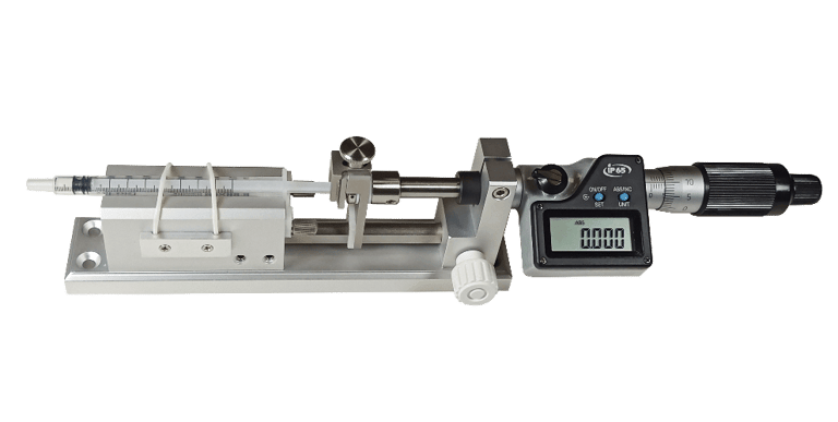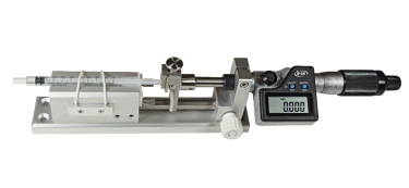 The digital syringe pump is a manual oparated pump with a digital display that allows a recise injection rate calculation. The Thomas manual microinjection pump (MMP) is a convenient tool for precise manual injection of fluid using our microinjection glass or metal pipettes. The design allows visual feedback of flow at the pipette tip. The resolution of the injection volume can be continuously varied from nanoliters to the microliter range, depending on the syringe used. The device is available with a digital (MMP-D, article number: AN001878) manual operated micrometer drive. The Model MMP-D has the mechanical micrometer head with a digital display with a resolution of 10 microns per division and advances 500 micrometers per revolution. The injector is constructed with anodized aluminum for excellent stability and durability. The piston of the micrometer can be slid across the rail to the syringe's plunger position. The device uses a 1ml syringe with excellent performance for high pressure injection. We connect our glass injection fibers (OD=120µm, quartz glass) directly or via a special thick wall plastic tube to the syringe.