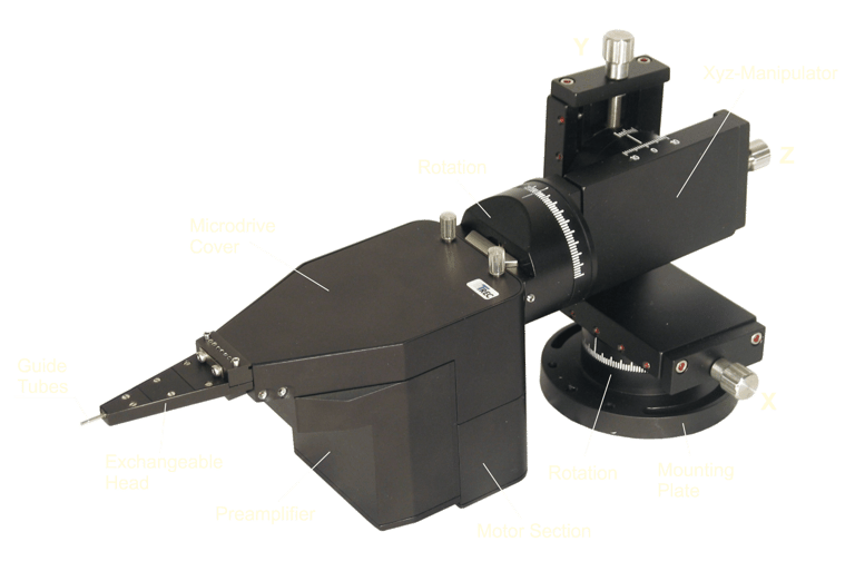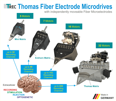 Advances up to 16 microelectrodes/tetrodes independently in 1µm steps up to 35.000µm (other electrode travel distances on request!)