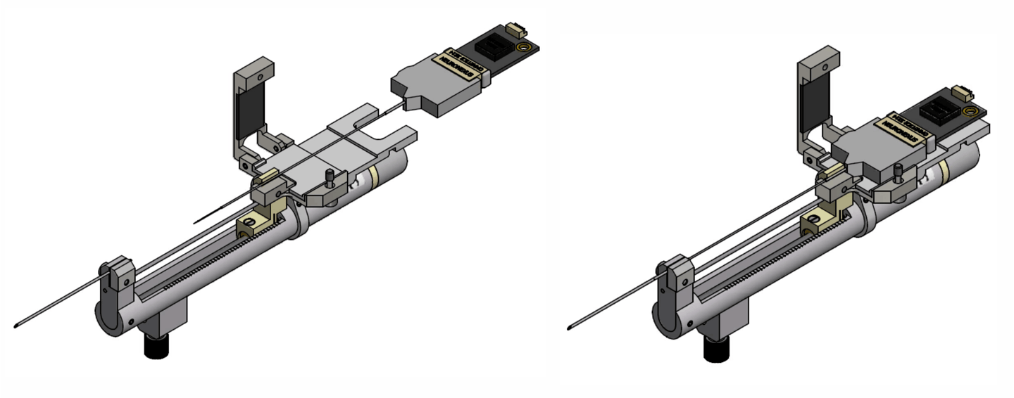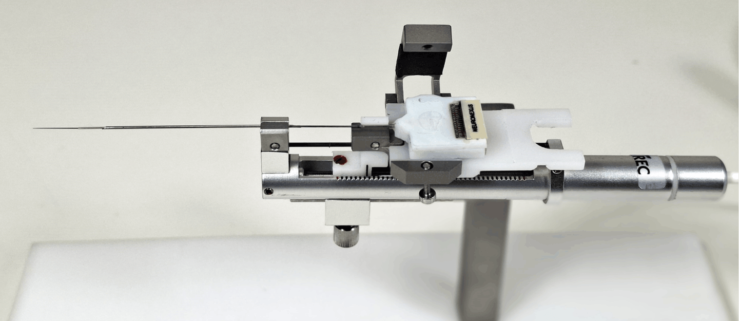 The MEM for Neuronexus probes is a low cost precision microdrive system for single shaft Neuronexus Vector Arrays for NHPs. The MEM microdrive has an electrode travel range of 40,000 µm (40 mm). Whether the maximum electrode travel distance is achieved depends on the shaft length of the Neuronexus Vector Array and the length of the electrode guide tube used. The MEM guide tube tapered so that it can easily penetrate the dura mater. The MEM is very lightweight and there are several options for integrating the system into a recording setup.