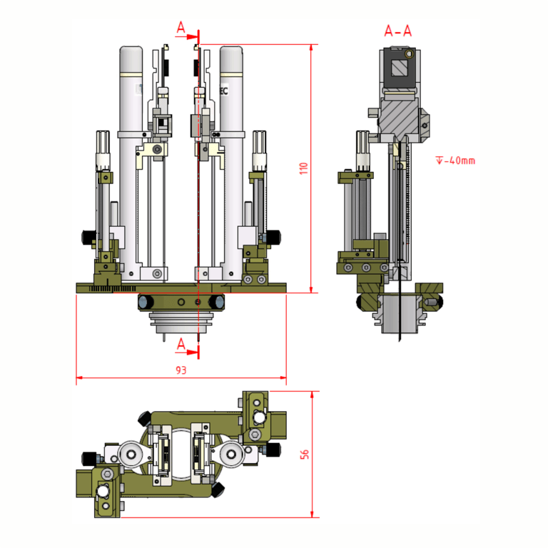 C: (Article number: AN001954) MEM recording chamber holder with joint and z-axis fine adjustment of z-position for more control during dura penetration with the sharp MEM guide tube. For reproducibility of lateral recording position a recording chamber grid is necessary and optional available.