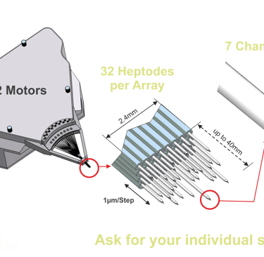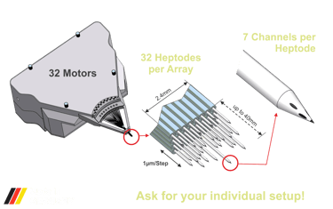 The max. electrode travel distance of each fiber microelectrode is up to 35mm (electrode travel extensions are possible and available on request!).
