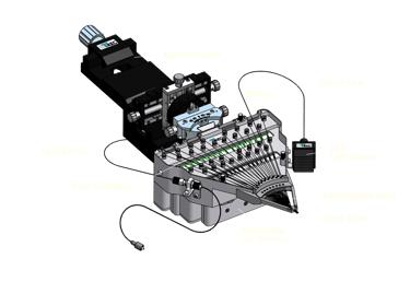 Drive can be used with electrodes, tetrodes, heptodes, injection cannulas, optical fibers