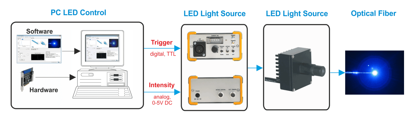 Thomas RECORDING LED light sources are controlled by a mains powered, constant-dc-current output light source controller that enables extremely precise control of light power for optogenetic stimulation.