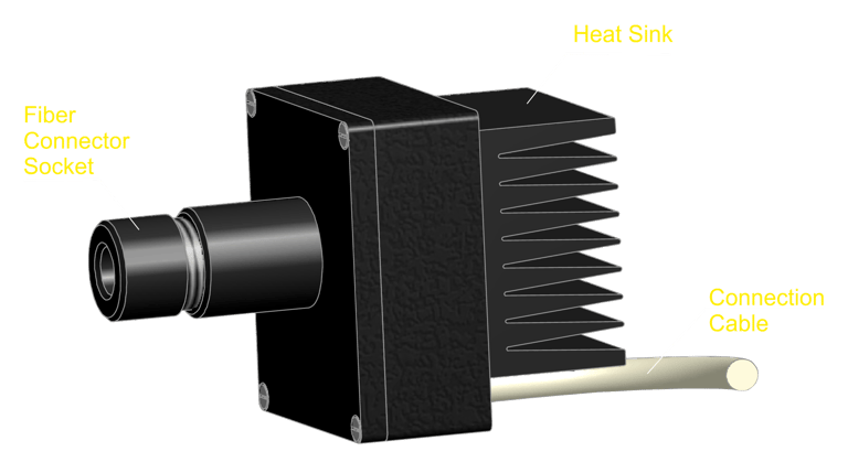 Thomas RECORDING LED light sources are avaialble in different colors (e.g. blue, yellow, green, etc.). The light source has a connection for TREC special optical fiber connectors, which ensures a secure connection between the optical fiber and the high-performance LED integrated in the light source housing. The power loss converted into heat by the LED is safely dissipated into the ambient air by the heat sinks integrated into the aluminum housing of the light source.