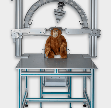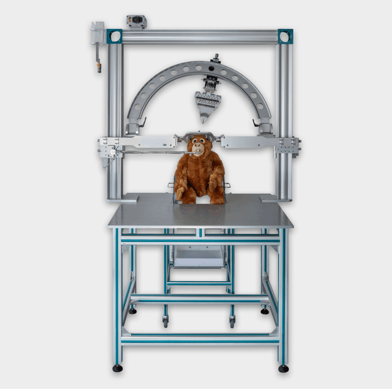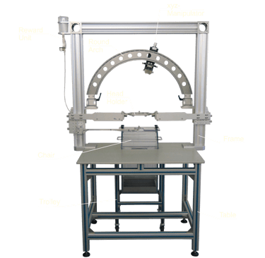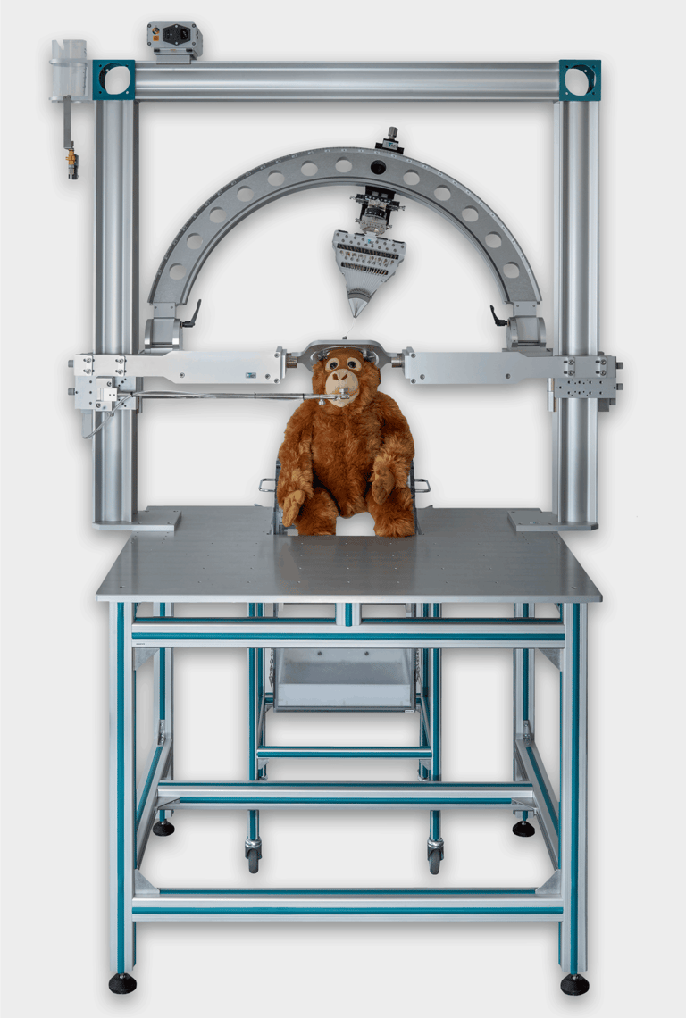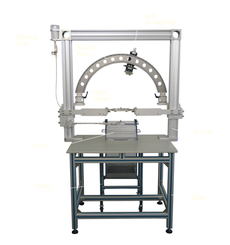 The PPS consists of a rigid table, a primate chair with trolley, a stable frame made of strong aluminum profiles with a curved guided rail, holding the instruments like a xyz manipulator for a Thomas Microdrive system and a reward unit. Furthermore the PPS is equipped with a unique three point head holding system. All components of the system are described below. The PPS is modular and although all components are designed to work together and we recommend using the complete system, you can also use individual components, such as our 3 point head holder, independently of our PPS. We are happy to help you integrate our NHP stereotaxic components into your setup.
