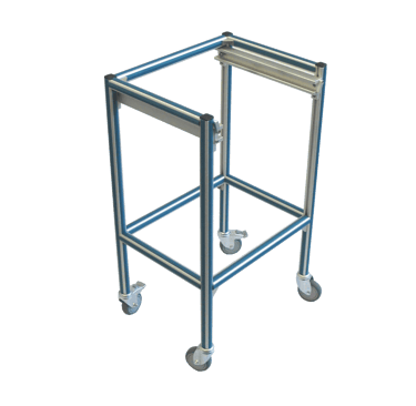 The trolley has a rail mount into which the monkey chair can be slid. The monkey chair can be slid directly into the mounting bay of the PPS table using the rollable trolley and locked in place to prevent it from rolling away.