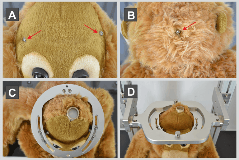 Unlike the widely used single-head post head restraints for NHPs, the Thomas 3-point head holder uses three implanted titanium pins. When the monkey is in the cage, you cannot see that it has a head restraint implant. The three pins are almost invisible in the animal's fur. In addition, the entire top of the head is free. A removable ring (inner ring, see figure C) is screwed onto the three implanted pins (two lateral pins in image A and one occipital pin in image B). This inner ring is then screwed into an outer ring (image D) that is connected to the PPS frame. This completely immobilizes the animal's head. At the same time, this type of head fixation takes animal welfare into account, as the monkey does not require large implants and is not restricted in its natural movement in the cage.