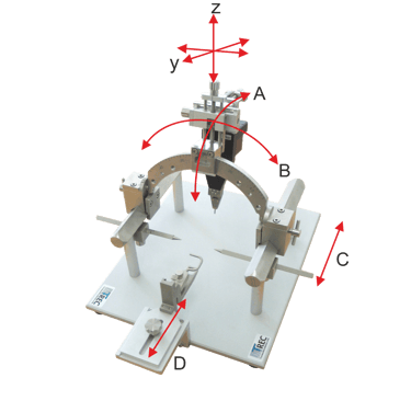 The major kinematic difference of the SASI in contrast to other stereotaxic instruments presently available on the market is, that in the SASI system all translational joints kinematically follow the rotational joints. This is realized by a curved guide (round arch) first introduced in animal stereotaxic instruments by Thomas RECORDING.