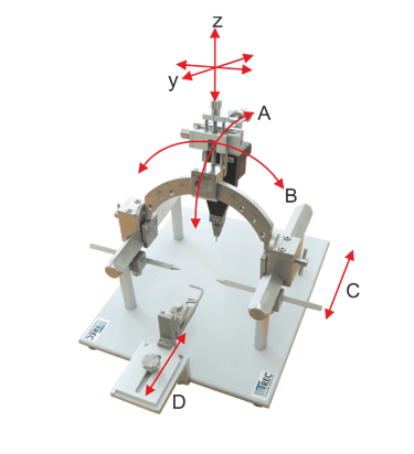 The Thomas RECORDING Small Animal Stereotaxic Instrument (SASI) has six degrees of freedom: