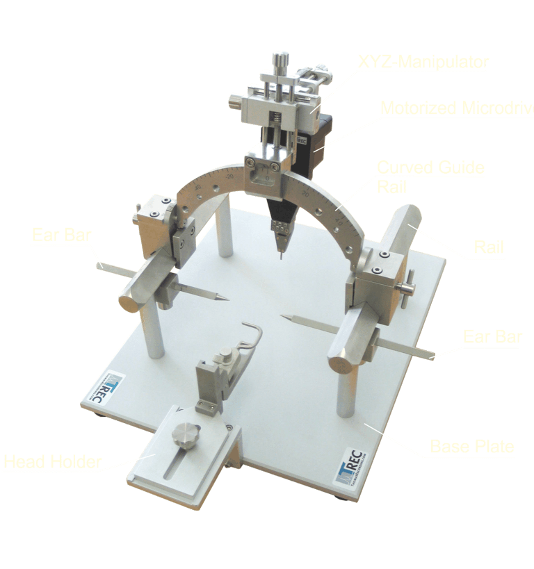 Thomas RECORDING offers a range of small animal stereotaxic instruments. The small animal stereotactic instrument SASI, originally designed by Thomas RECORDING in 1998, presents an exiting stereotactic manipulator for precise stereotactic procedures on small animals. The SASI is a versatile, easy-to-use instrument that facilitates proper alignment of small animals for the stereotaxic placement of electrodes, micropipettes, cannula and other devices.